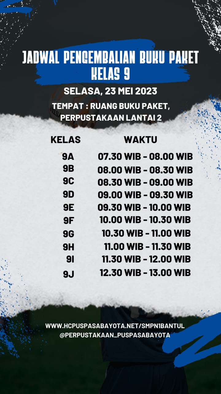 Diumumkan kepada siswa-siswi kelas 9 bahwa pengembalian buku paket akan dilayani pada hari Selasa, 23 Mei 2023 di ruang buku paket, perpustakaan Puspasabayota lantai 2 dengan jadwal sesuai yang tertera dalam flyer.