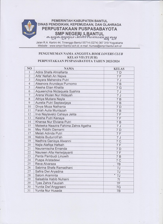 PENGUMUMAN NAMA ANGGOTA BOOK LOVERS CLUB KELAS 7 TAHUN 2023/2024