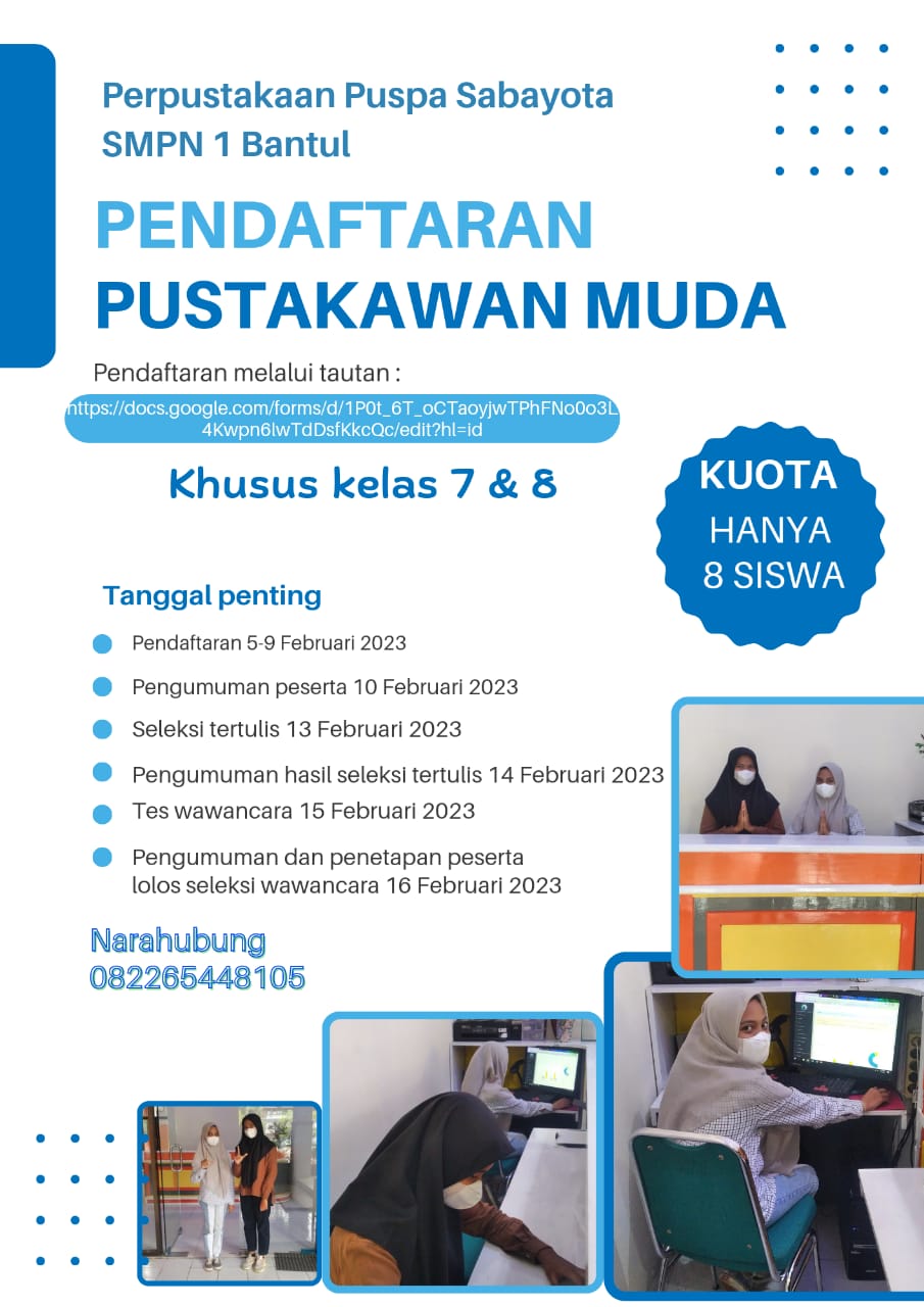 Pustakawan merupakan garda terdepan dalam penyebaran informasi di tengah-tengah banjirnya informasi yang terjadi saat ini. Pustakawan harus bisa memilah dan memilih informasi yang tepat, aktual, dan faktual untuk disampaikan kepada pemustaka. Maka dari itu Perpustakaan Puspa Sabayota SMPN 1 Bantul mengundang siswa-siswi HC untuk melibatkan diri, turut serta dalam menjadikan generasi muda yang literate, dengan menjad pustakawan muda HC.